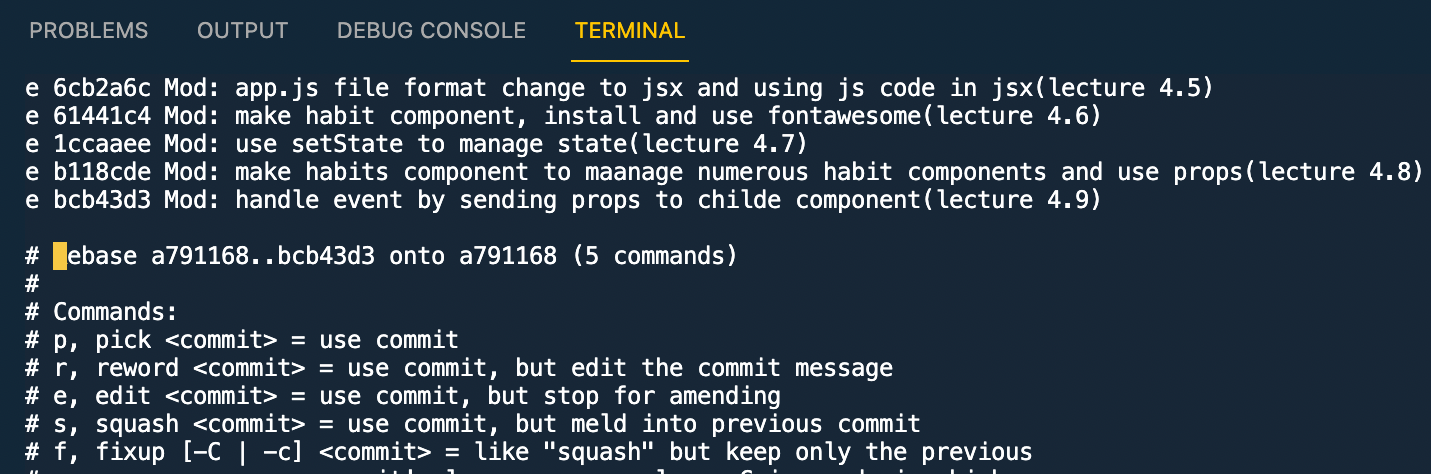 3번 과정까지 끝마치면 이제 다시 터미널로 나오게 되고, edit으로 변경할 커밋들이 존재하기 때문에 여기서 부터 rebase를 진행하면 된다.