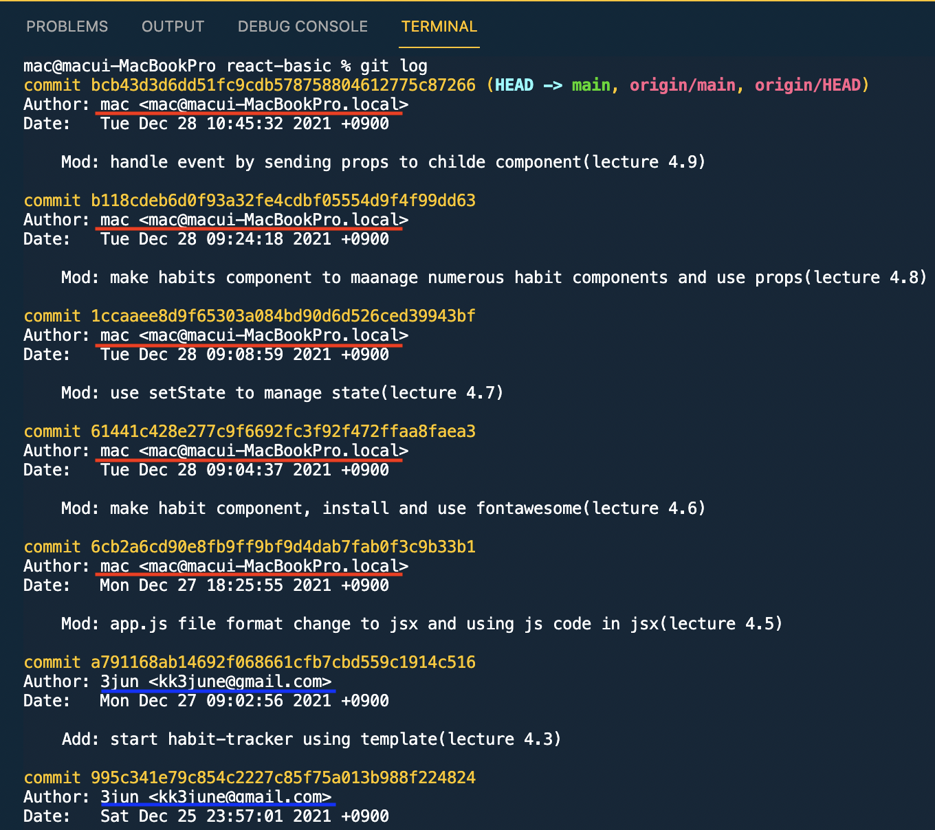 제 경우에는 5개의 커밋의 작성자를 수정해야하기 때문에 위 코드를 다섯번 반복하였다.
