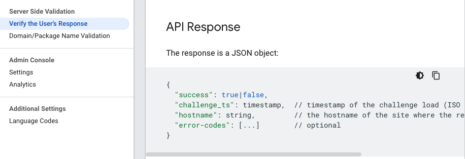 코드가 제대로 동작하지 않았을 때, 구글 리캡챠 어드민 콘솔에서 사용자에 대한 인증이 제대로 실행되고 있지 않다는 메시지창이 있었다. 뿐만 아니라 공식문서에도 아래와 같이 서버사이드에서 인증 과정이 존재하고 그에 따라 api response가 전달됨을 확인할 수 있었다.