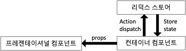 리액트 프로젝트에서 리덕스를 사용할 때 가장 많이 사용하는 패턴은 주로 화면에 UI를 보여주는 프레젠테이셔널 컴포넌트와 리덕스와 연동하여 state를 받아오거나 리덕스 스토어에 액션을 디스패치하는 역할을 하는 컨테이너 컴포넌트로 분리하는 것이다.