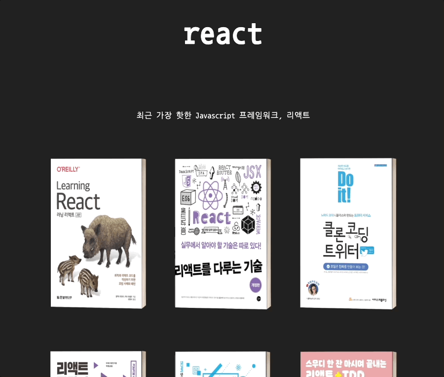 가장 중점을 두었던 3D 도서 이미지와 애니메이션!! 각 도서에 마우스를 hover 하면 저렇게 기울여진다.