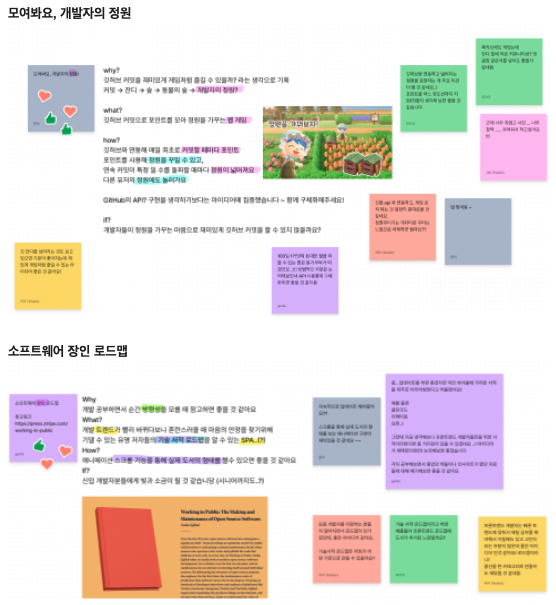 말로만 이루어지는 회의와 달리 피그잼을 통해 모두가 말보다 글로 우선 각자 자신만의 생각을 써놓고 이야기를 나누니 서로 생각 정리도 잘되고 각자 상대방이 어떤 생각을 갖고 있는지 보다 더 깊게 이해할 수 있었다. 또한 말빨이 좋은 사람, 목소리가 큰 사람의 결정대로 흘러가는 기존의 회의와 달리 모두의 의견 중에서 좋은 부분만 취합하여 더 나은 방향으로 의견을 취합할 수 있었다.