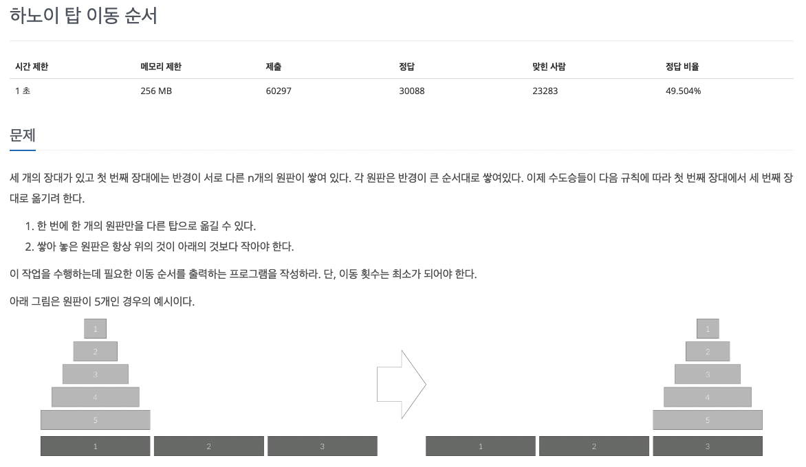세 개의 장대가 있고 첫 번째 장대에는 반경이 서로 다른 n개의 원판이 쌓여 있다. 각 원판은 반경이 큰 순서대로 쌓여있다. 이제 수도승들이 다음 규칙에 따라 첫 번째 장대에서 세 번째 장대로