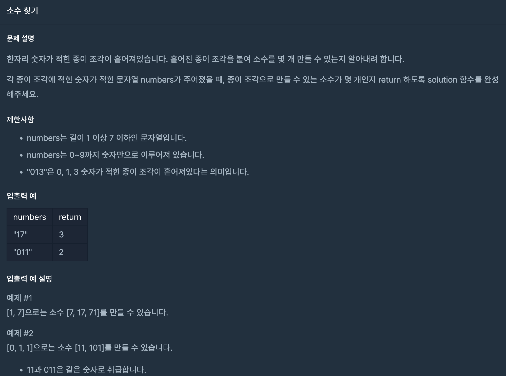 isPrimeNumber 가 틀렸으리라고는 생각지 못하고 getPermutaion에 어떤 문제가 있는지만 고민했었는데, 엉뚱한 곳에서 문제를 해결하였다. 소수인지 판단을 할때 1 이하일때는 소수가 아니고, 2는 소수이므로 이 2가지에 대한 처리를 해줘야 하는데, 첫번째 solution에서 num < 2 만 처리하고 num === 2일 때 처리를 빠뜨려 먹어서 에러가 발생했다.