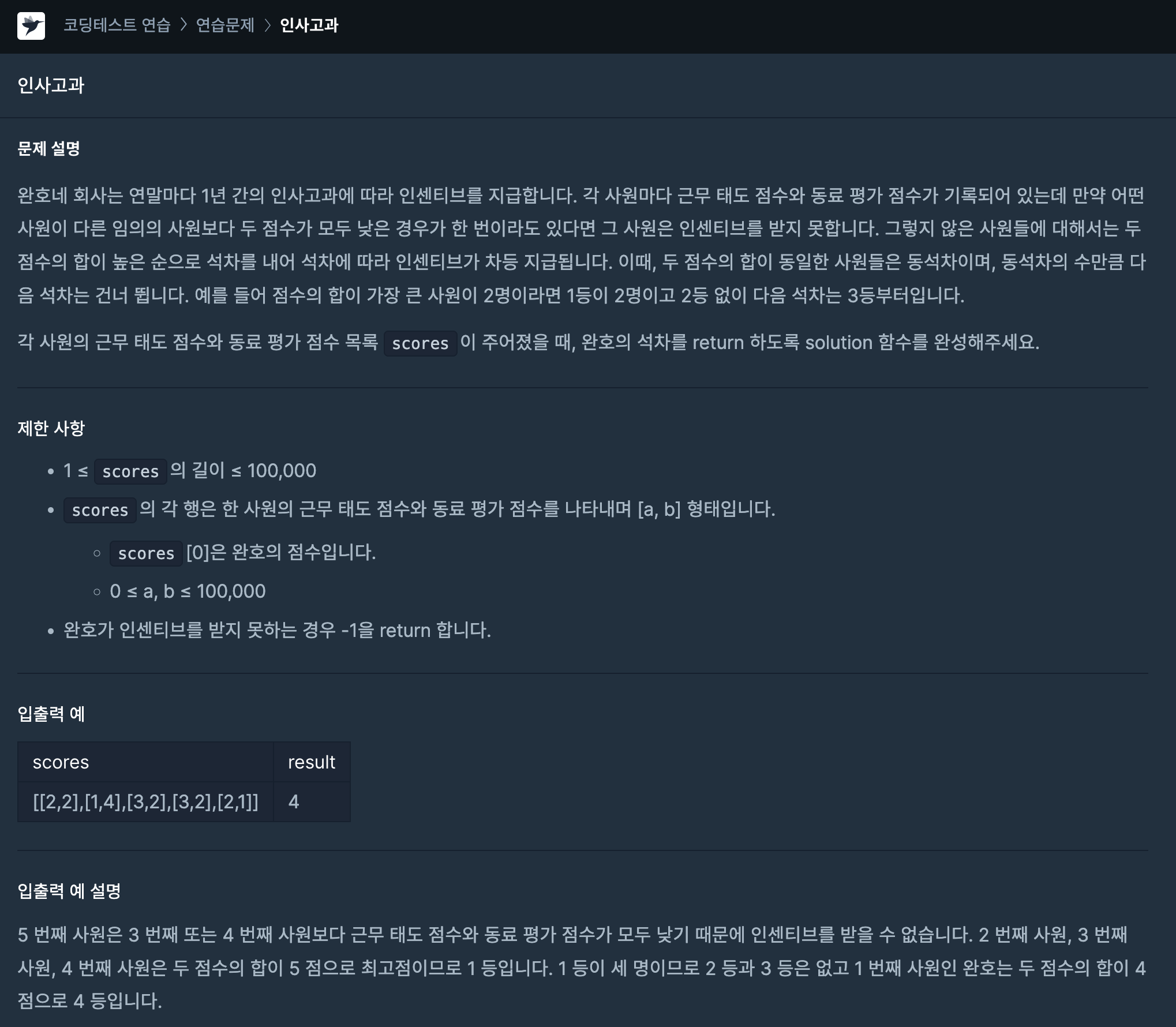 3. 그렇지 않은 경우 인센티브 대상자 배열을 반복문을 사용하여 index 값이 1인 인자부터 index 값이 0인, 가장 첫 번째에 위치하는 인자와 두 점수의 합을 비교하여 index 0의 인자보다 합이 큰 경우 answer 값에 1을 추가하여 등수를 구했다.