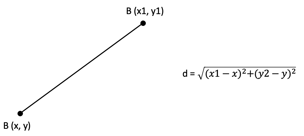 좌표평면 위의 두 점 A(x, y), B(x1, y1) 가 존재한다고 할 때, 이 두 점 사이의 거리 d 는 아래와 같은 공식을 사용하여 구할 수 있다.