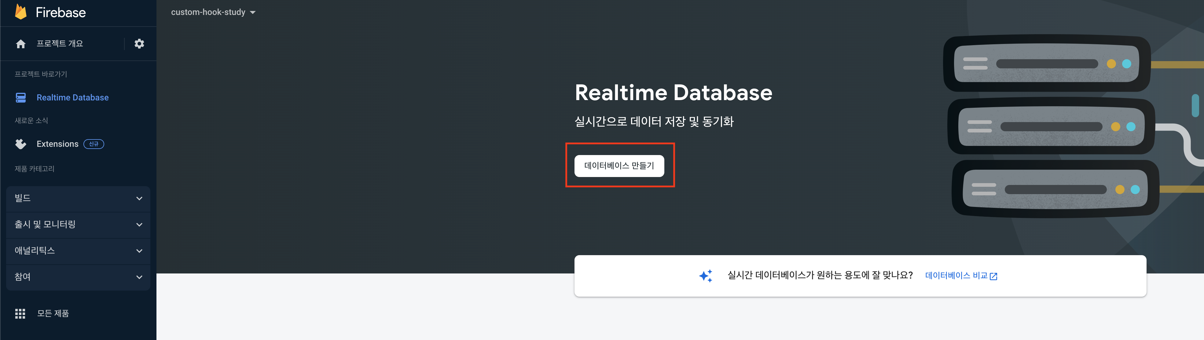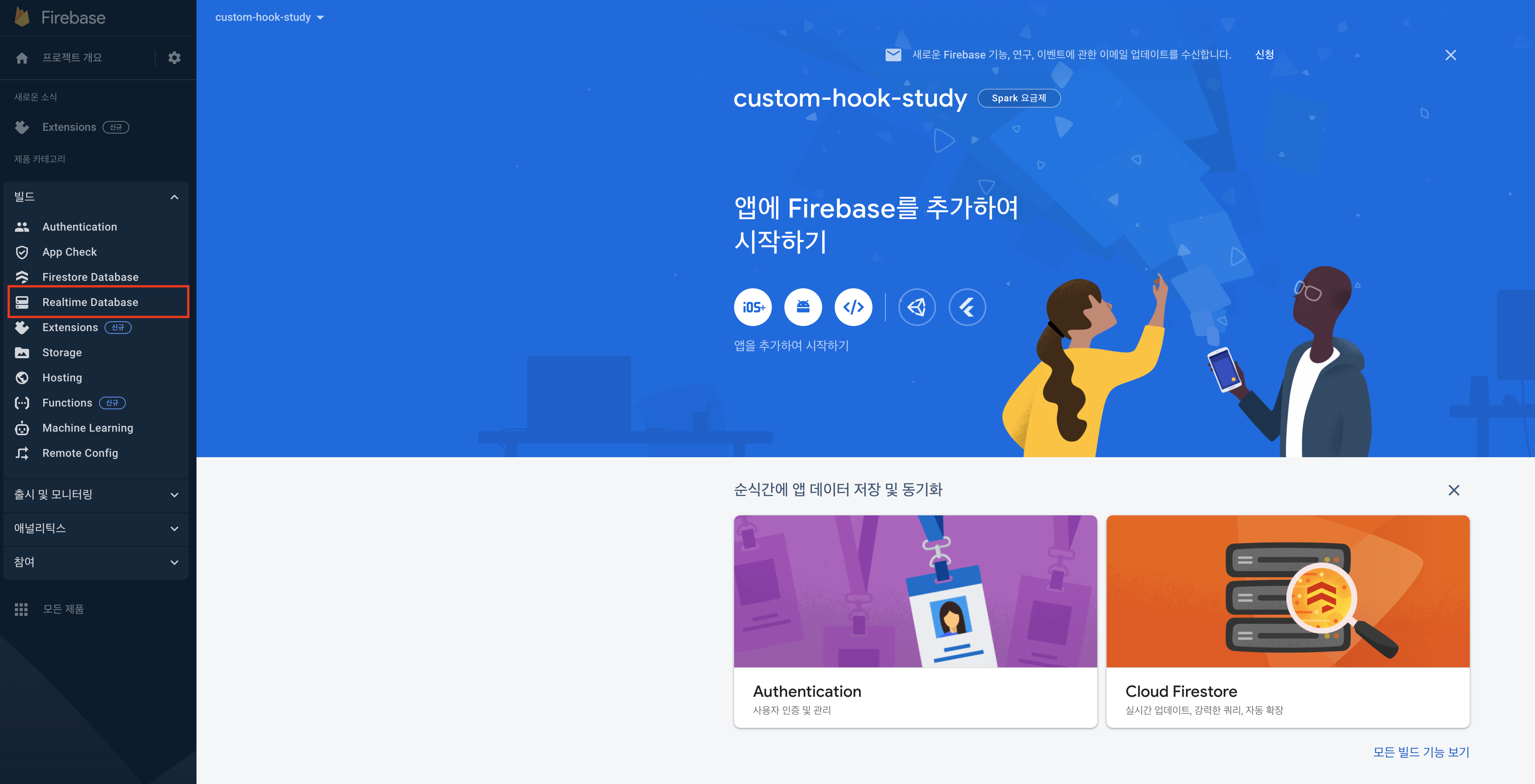 여러가지 기능을 제공하지만 api 구현을 위해 realtime database 즉, 실시간 데이터베이스를 클릭해준다.
