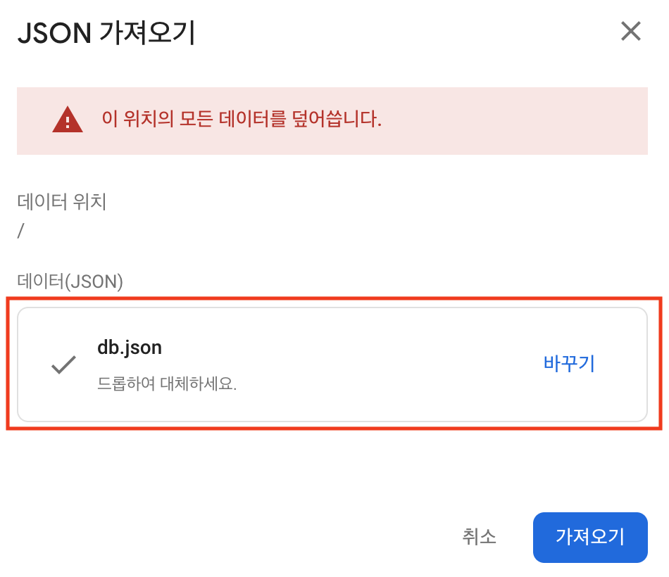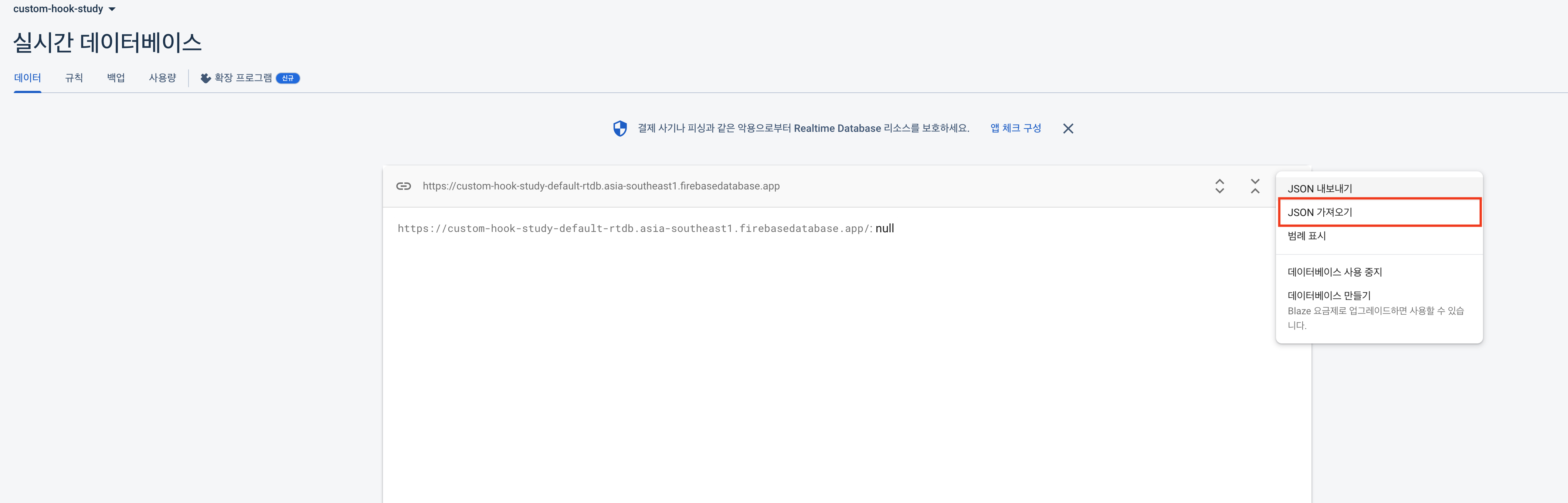 이제 정말 나만의 DB 가 생성되었다. url을 사용하여 request를 보내 데이터를 생성해도 되고, 만약에 초기 데이터 값이 필요한 상황이라면 아래 점 세개 아이콘을 클릭하면 JSON 가져오기 메뉴가 있는데, 여기서 초기 데이터로 사용할 json 파일을 가져와서 데이터를 추가할 수 있다.