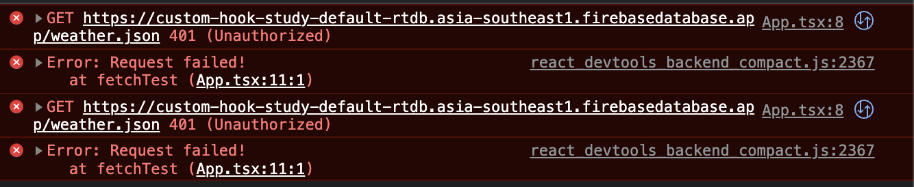 보통은 에러가 해결되지 않으면 수정했던 파일은 되돌려놓는게 맞지만, 이 부분을 그럴 필요가 없다. CORS 에러를 해결하더라도 규칙의 모든 값들이 false로 되어있다면, 위에서 짐작한 것과 같이 모든 사용자가 DB에 대한 권한이 존재하지 않으므로 본인 역시 데이터를 요청할 때 401 Unauthorized 에러가 발생하기 때문이다.