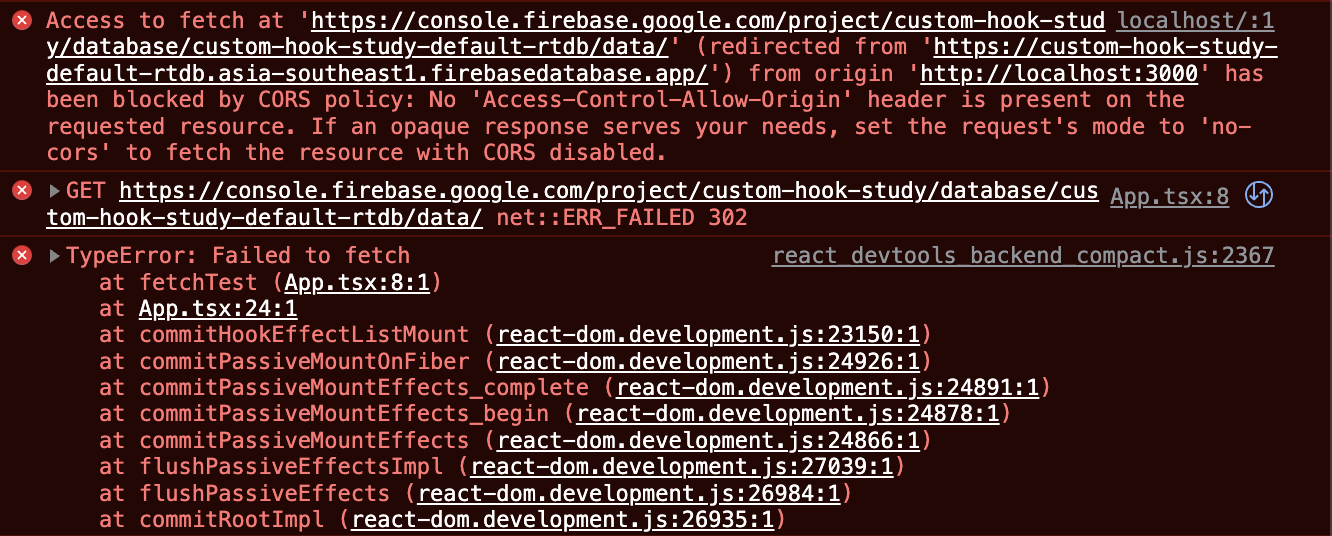 프론트 서버는 localhost 이며, Firebase 의 실시간 db는 당연히 localhost가 아닐테니 발생하는 에러라고 짐작했다.