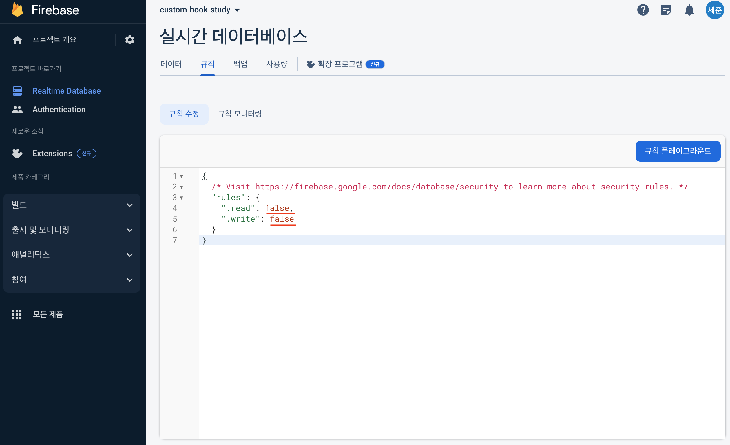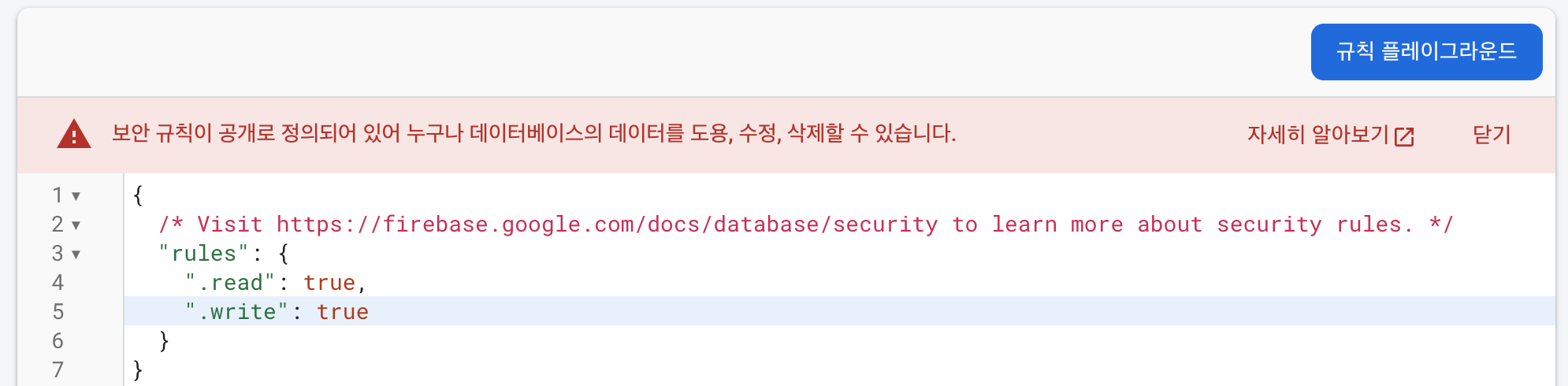 내 프로젝트의 규칙을 확인해보니 false 로 되어 있어, 누구든 권한이 없도록 세팅이 되어 있어 에러가 발생하는 것인가 싶었다.