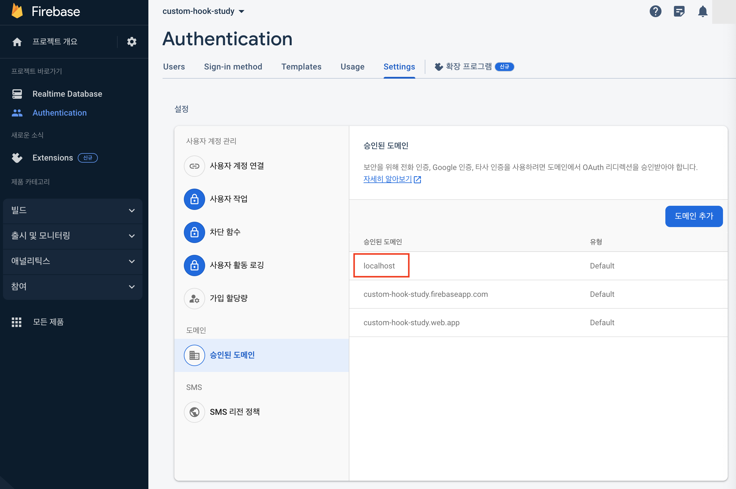 해당 프로젝트 콘솔에서 Authentification 메뉴 클릭 -> settings 탭 클릭 -> 승인된 도메인 메뉴 클릭